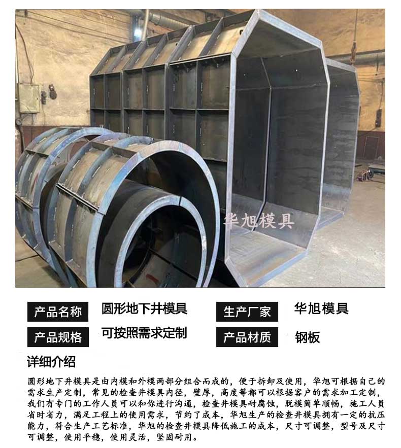華旭生產各種規格型號的圓形地下井模具,采用q235鋼板生產,我們定制的圓形檢查井模具的面板厚度為4mm,筋板5*60mm,華旭根據我們的施工需求結合圖紙生產出來的,整體的效果還不錯,使用了一段時間,使用順手,整體還是不錯的。