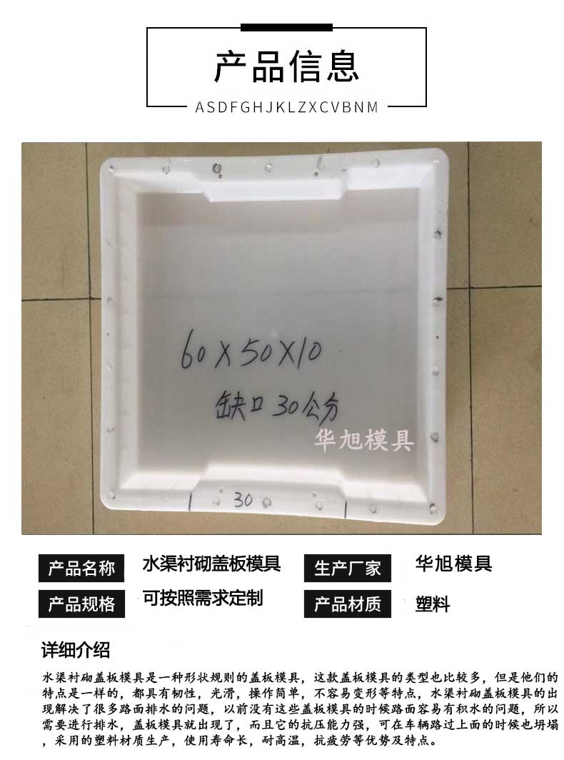 華旭可根據客戶需要定制200mm*400mm*100mm、250*500*80mm、250*500*120mm、300*500*100mm、300*450*100mm等各種規格型號的蓋板模具。