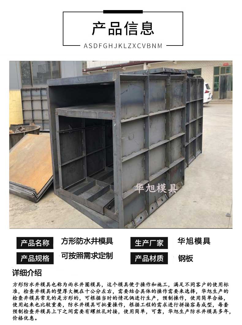 華旭生產方形防水井模具、雨水井圈模具多年,預制操作,可反復使用,便于施工,滿足不同施工周期,符合施工現場的需求,可按照需求定制,生產簡單,表面光滑,外形美觀,深受市政的歡迎。
