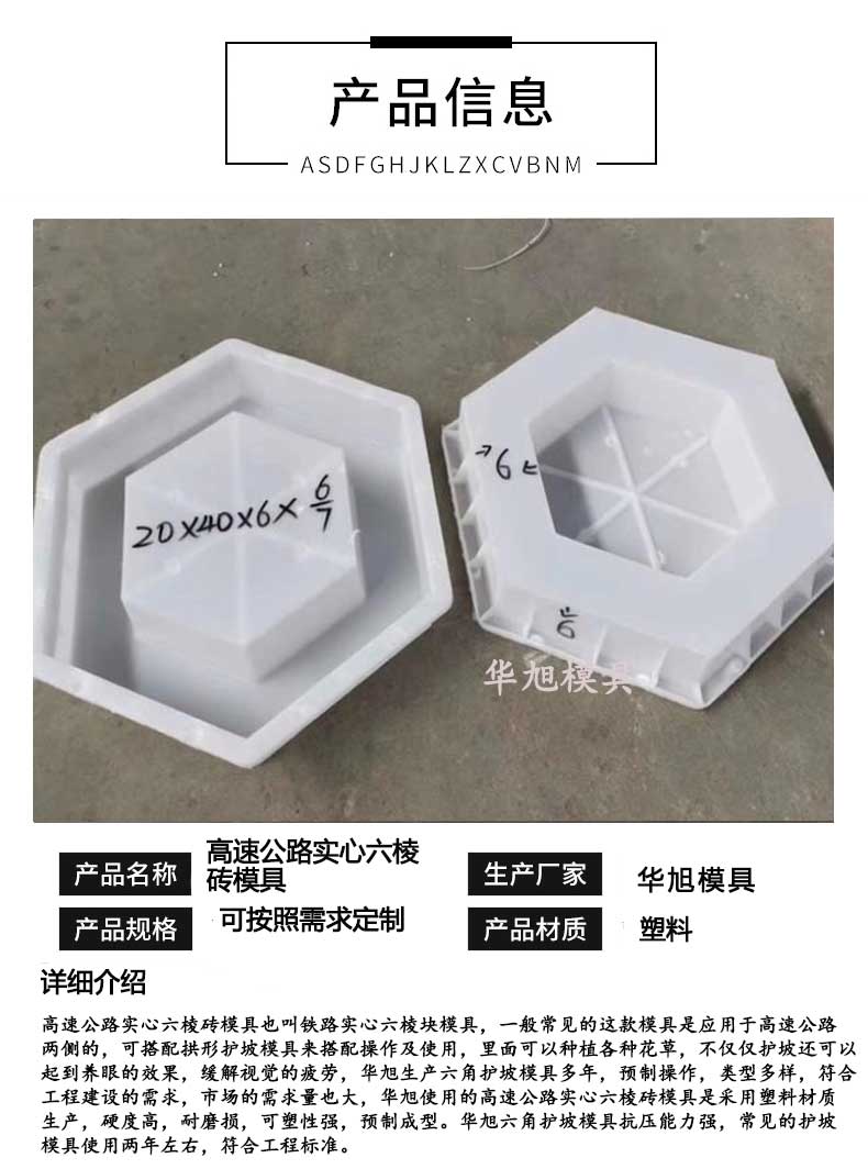 華旭生產(chǎn)高速公路實(shí)心六棱磚模具、鐵路實(shí)心六棱塊模具多年,符合生產(chǎn)原理及規(guī)則,質(zhì)量可靠,可設(shè)計(jì)定制,價(jià)格優(yōu)惠。