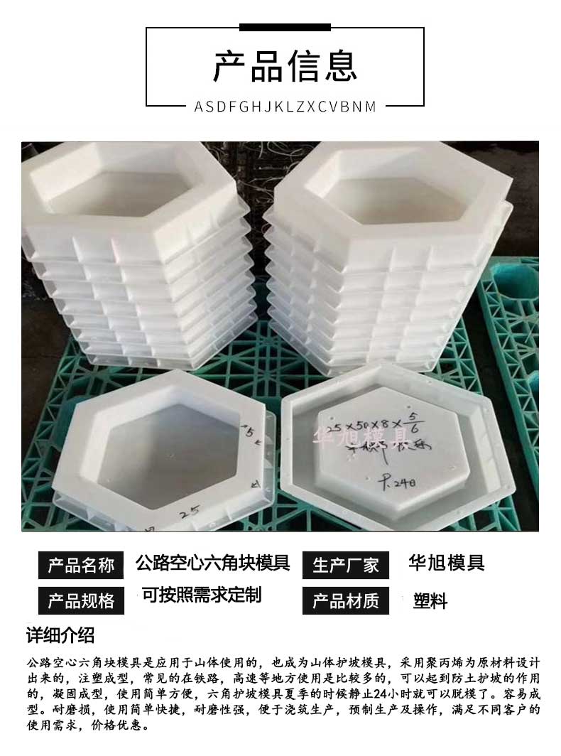 華旭生產公路空心六角塊模具、山體護坡模具多年,可通過設計的圖紙進行生產,滿足基本的護坡的原理,機械操作,使用簡單快速,可以起到美化環境的作用,價格優惠。